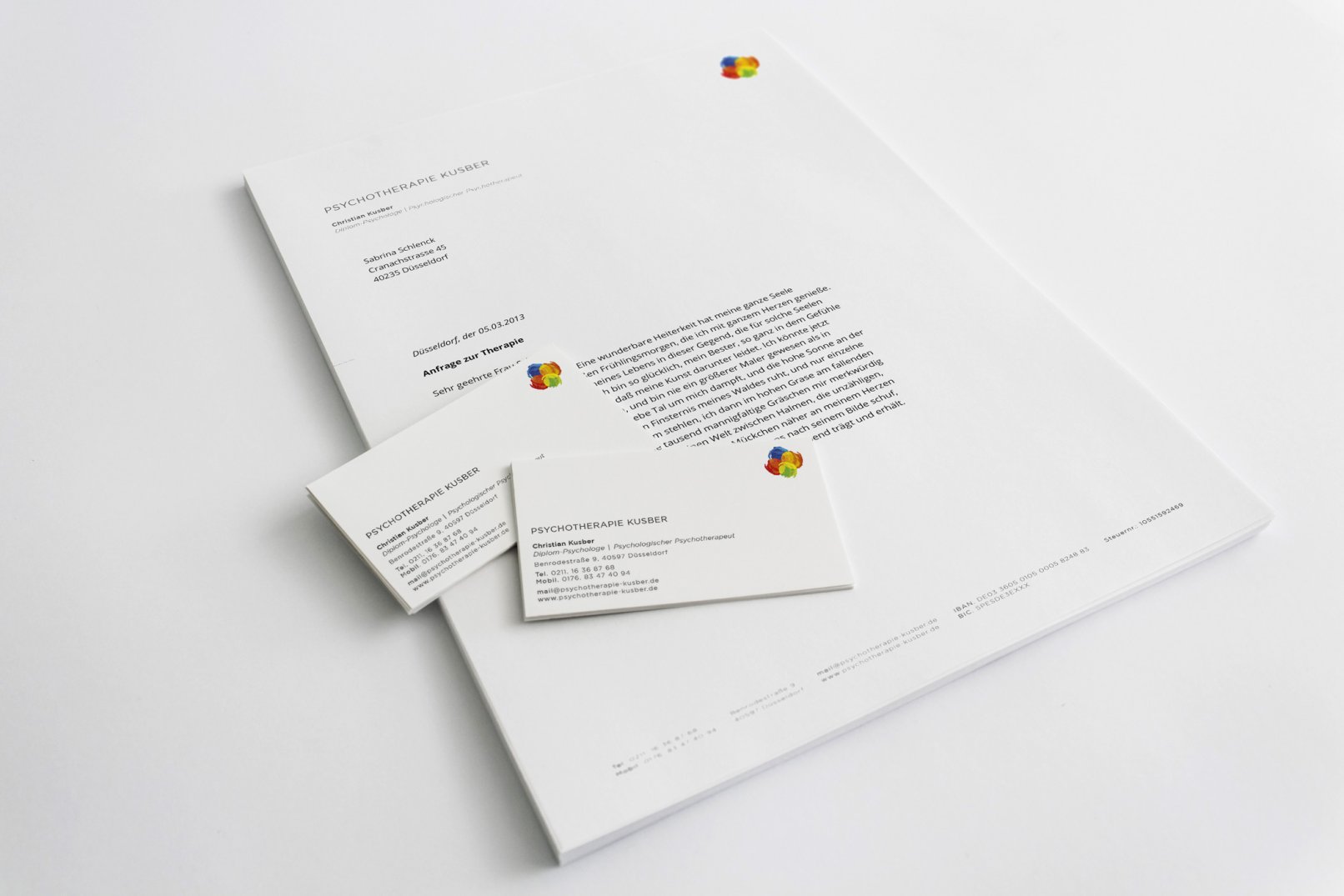 Im Fokus des Corporate Designs stand die Kernkompetenz des Therapeuten verschiedene Therapieansätze dynamisch anwenden zu können. Daraus entstand eine visuelle Identität, die ebenfalls die Dynamik dieses Ansatzes aufnimmt.